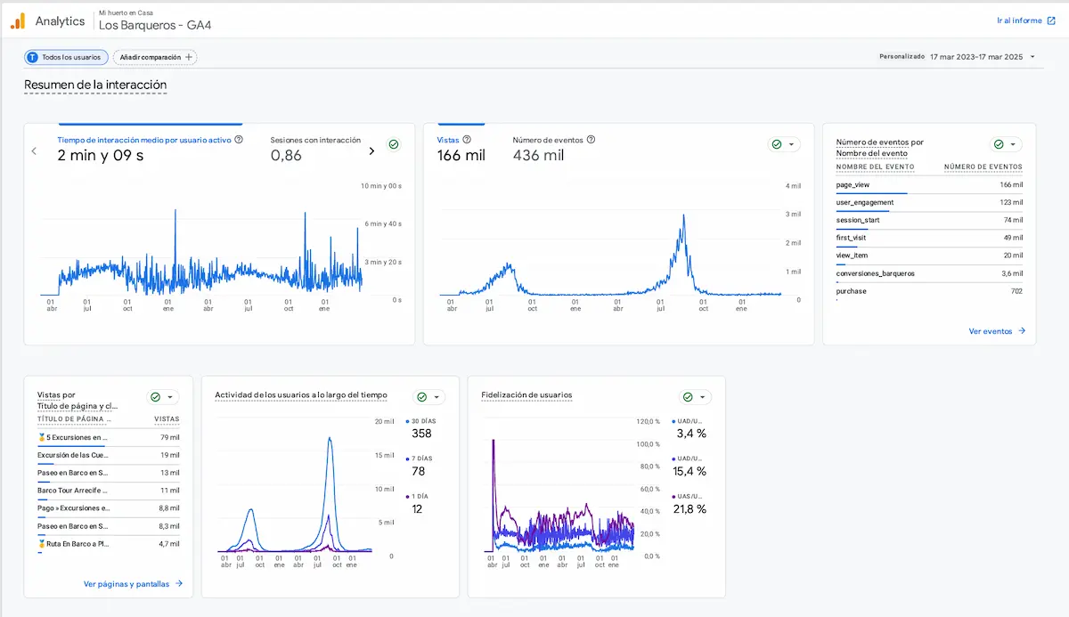 Vistas de página: El sitio web de Los Barqueros, paseosenbarcocabodegata.es, recibió 166 mil vistas, lo que refleja un aumento considerable en el tráfico generado por las campañas de ads.